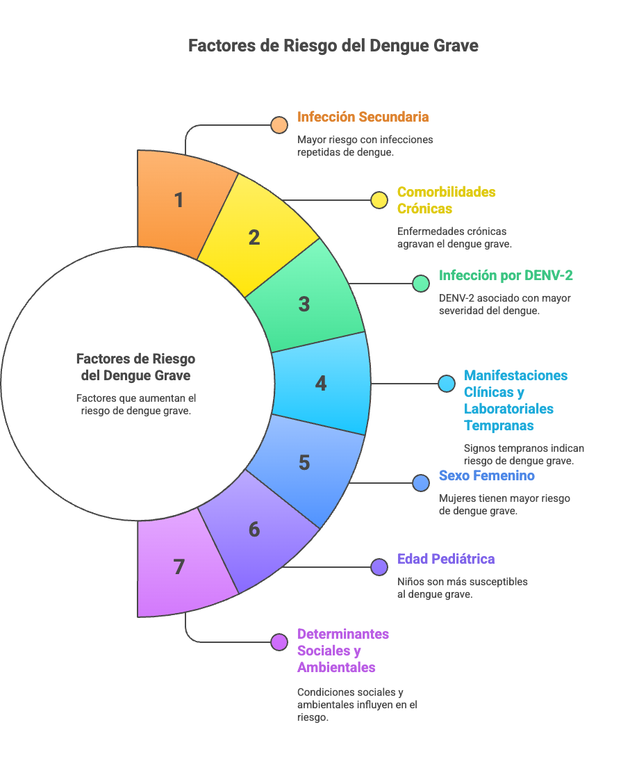 Los factores de riesgo para desarrollar dengue y dengue grave son multifactoriales e involucran características demográficas, clínicas, virológicas y sociales. La literatura médica reciente identifica los siguientes factores principales: