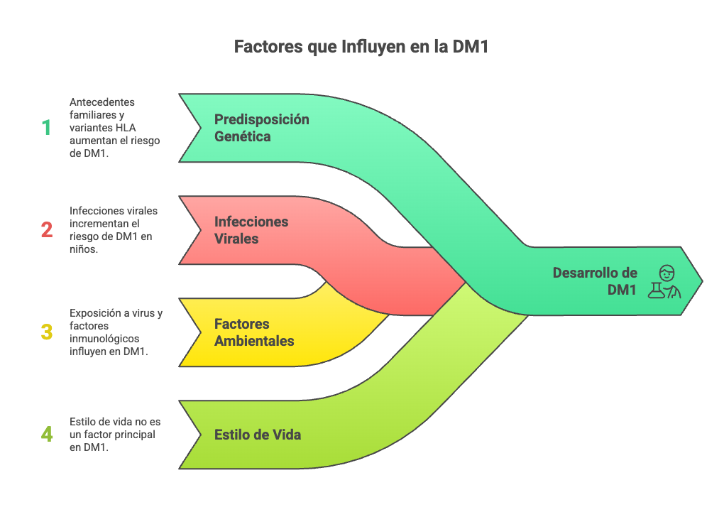 Infecciones virales como Coxsackie virus, enterovirus, citomegalovirus y rubéola han sido asociadas a mayor riesgo de desarrollar DM1en niños y adolescentes.