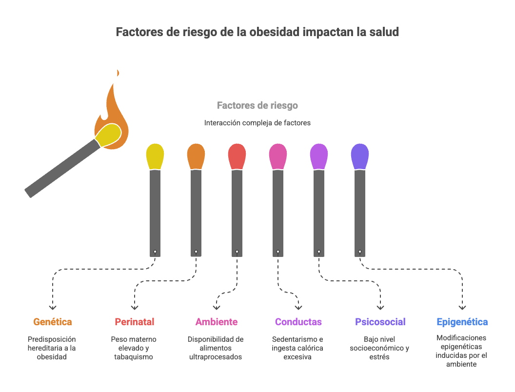 Los principales factores de riesgo de la obesidad, incluyen una interacción compleja entre factores genéticos, ambientales, conductuales, sociales y epigenéticos. La evidencia más reciente destaca los siguientes elementos: