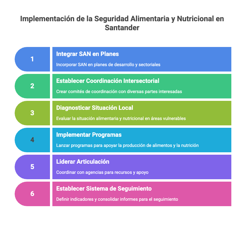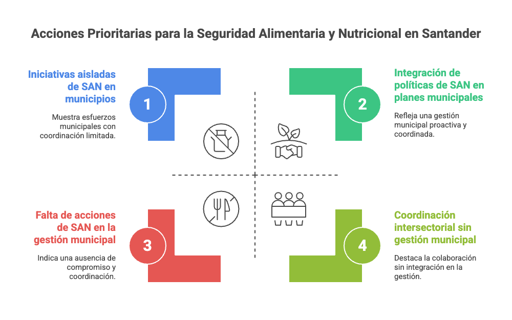 A Partir del CONPES 113 las acciones prioritarias para los municipios de Santander se centran en incorporar la seguridad alimentaria y nutricional en su gestión, fortalecer la coordinación intersectorial y ejecutar intervenciones concretas sobre población vulnerable. Estas acciones deben alinearse con el CONPES 113, el Plan Nacional de SAN y el Plan Departamental de Seguridad Alimentaria y Nutricional de Santander.