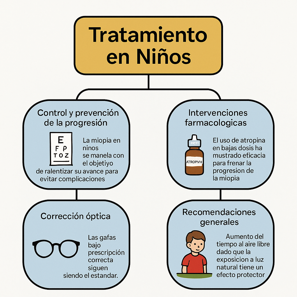 Desde el punto de vista clínico, la miopía se corrige habitualmente con anteojos o lentes de contacto que ajustan el enfoque de la luz sobre la retina. También existen tratamientos para frenar su progresión, especialmente en la niñez, como el uso de atropina en bajas dosis o terapias ópticas específicas. En etapas adultas se puede considerar la cirugía refractiva para corregir el defecto visual.