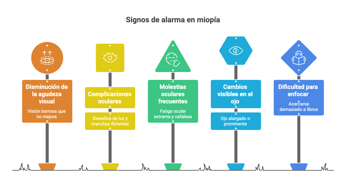 - Aumento significativo del grado de miopía en poco tiempo (más de -0.50 dioptrías por año en niños).