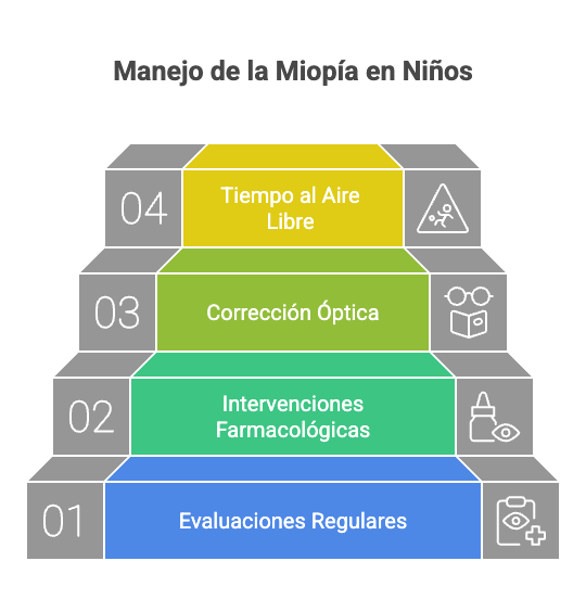 - La miopía en niños se maneja con el objetivo de ralentizar su avance para evitar complicaciones a largo plazo. Se recomiendan evaluaciones periódicas con topografía corneal, refracción bajo cicloplejia y biometría óptica anual.