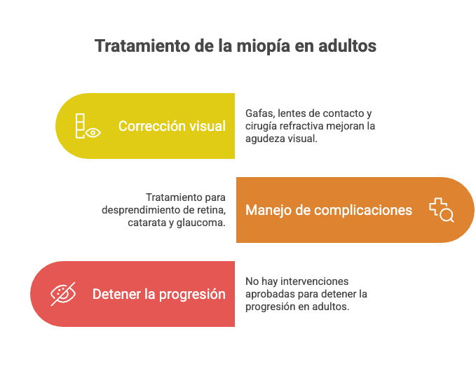 - No hay intervenciones aprobadas para detener la progresión en adultos dado que la mayoría tienen la miopía estabilizada.