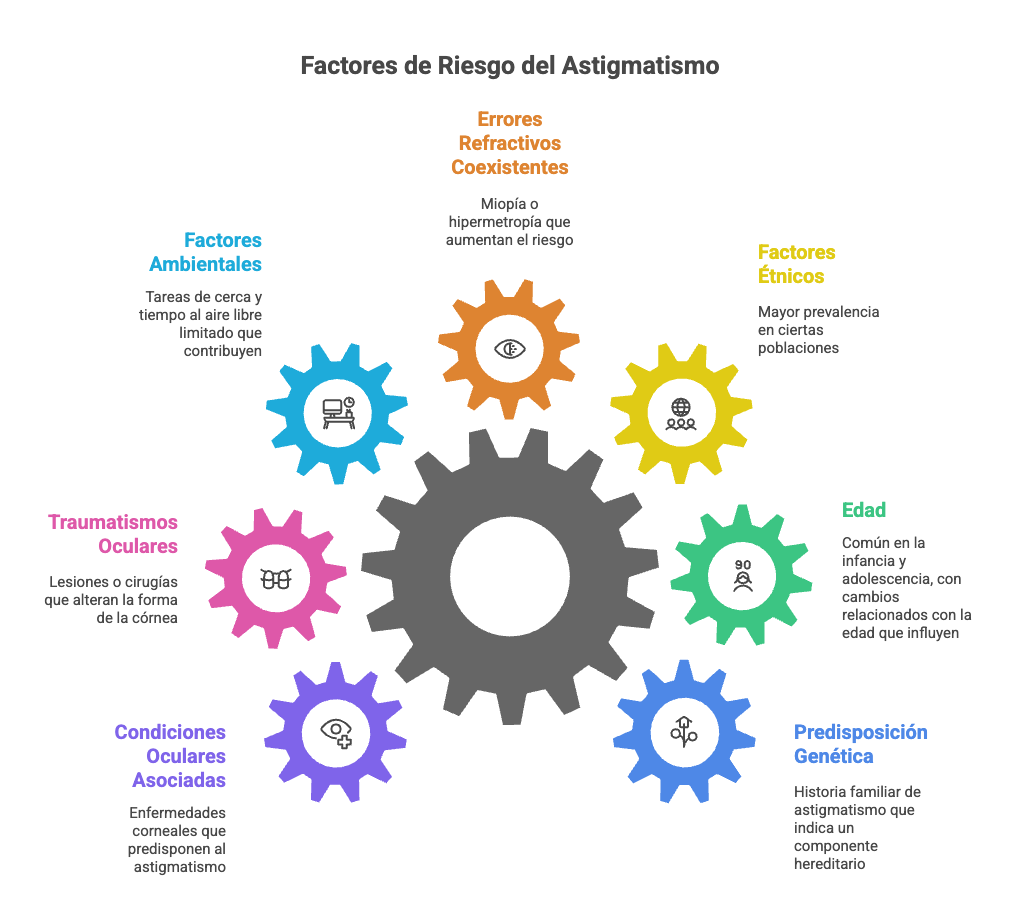 Errores refractivos coexistentes: La presencia de miopía o hipermetropía se asocia frecuentemente con astigmatismo, incrementando el riesgo de su aparición y severidad.