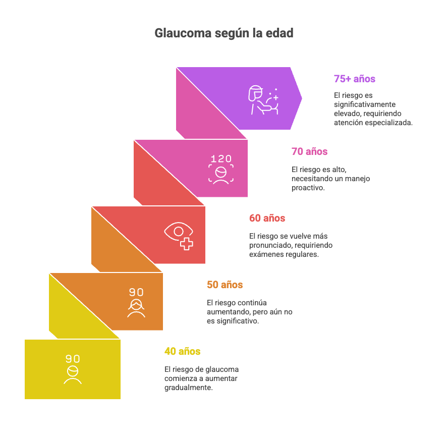 Los factores de riesgo asociados al glaucoma varían en importancia según el grupo etario, aunque algunos son universales y otros predominan en ciertas edades. La edad avanzada es el principal factor de riesgo en adultos, con un aumento progresivo de la prevalencia a partir de los 40 años y un riesgo significativamente mayor en mayores de 75 años; por cada década adicional después de los 40 años, el riesgo de glaucoma de ángulo abierto aumenta de manera significativa.