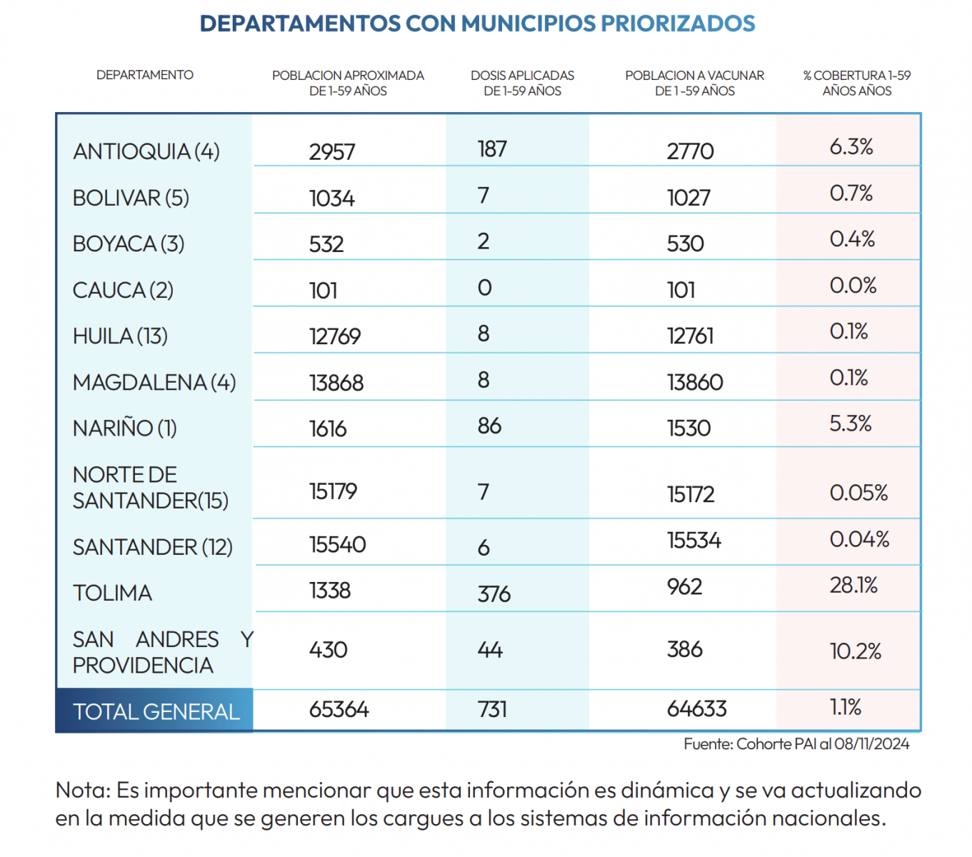 A nivel municipal, los indicadores más importantes incluyen: la incidencia de casos confirmados, la cobertura vacunal y la mortalidad. Datos recientes evidencian variabilidad en la cobertura de vacunación contra fiebre amarilla, zonas urbanas con alta cobertura y municipios rurales o fronterizos con índices inferiores al recomendado, lo cual aumenta el riesgo de brotes locales.