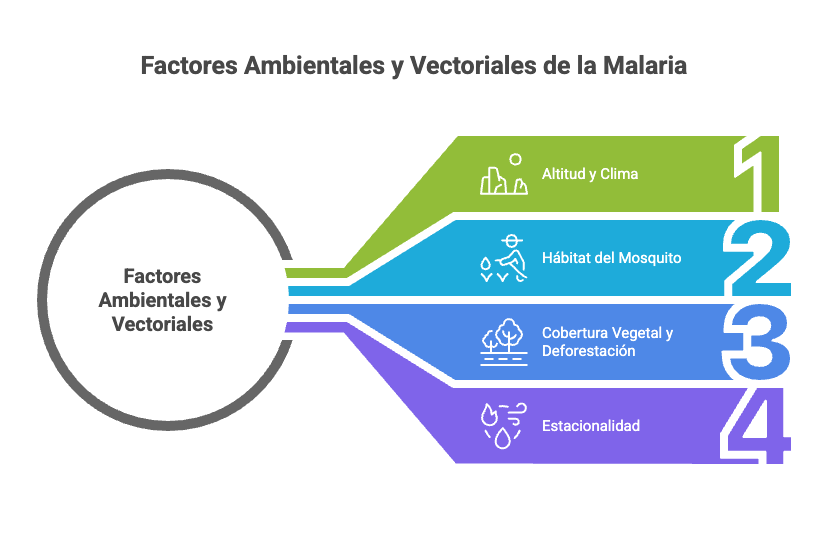 Zonas ubicadas a menor altitud presentan mayor presencia de mosquitos anófeles, vectores de la malaria. Temperaturas más cálidas favorecen la reproducción del mosquito y el desarrollo del parásito dentro del vector.