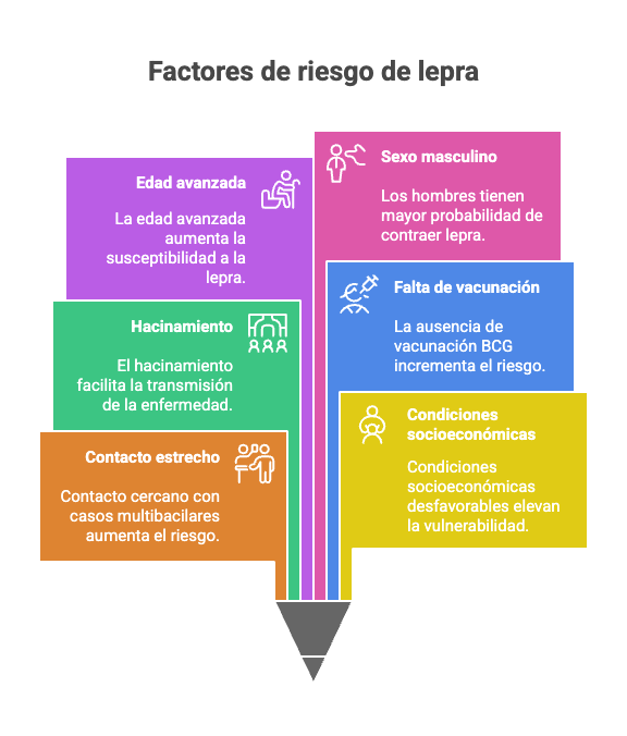 El principal factor de riesgo es el contacto estrecho y prolongado con un caso índice de lepra, especialmente si el paciente presenta una forma multibacilar o una alta carga bacilar en el frotis cutáneo. Las condiciones socioeconómicas adversas, como la pobreza, el hacinamiento, la inseguridad alimentaria y el bajo nivel educativo, se asocian consistentemente con mayor incidencia de lepra. La falta de acceso a saneamiento básico, como la ausencia de letrinas, también se ha identificado como factor de riesgo independiente. El trabajo manual y vivir en áreas rurales o con servicios de salud limitados aumentan la vulnerabilidad.