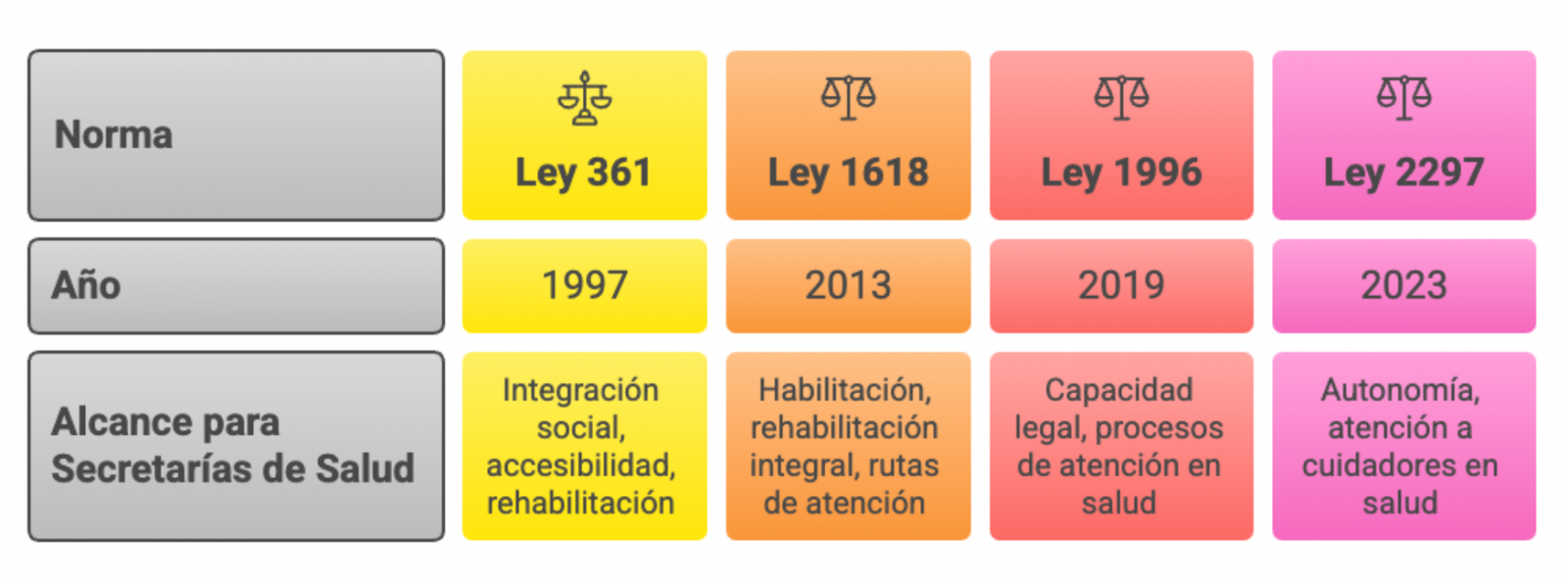 Así mismo, en la Constitución Política de Colombia de 1991 se establecieron principios fundamentales consagrados en los Artículos 13, 47, 49, 54 (Ver figura 1). También, aplicable al nivel territorial se estableció el marco normativo guía para las secretarias de salud (Ver tabla1).