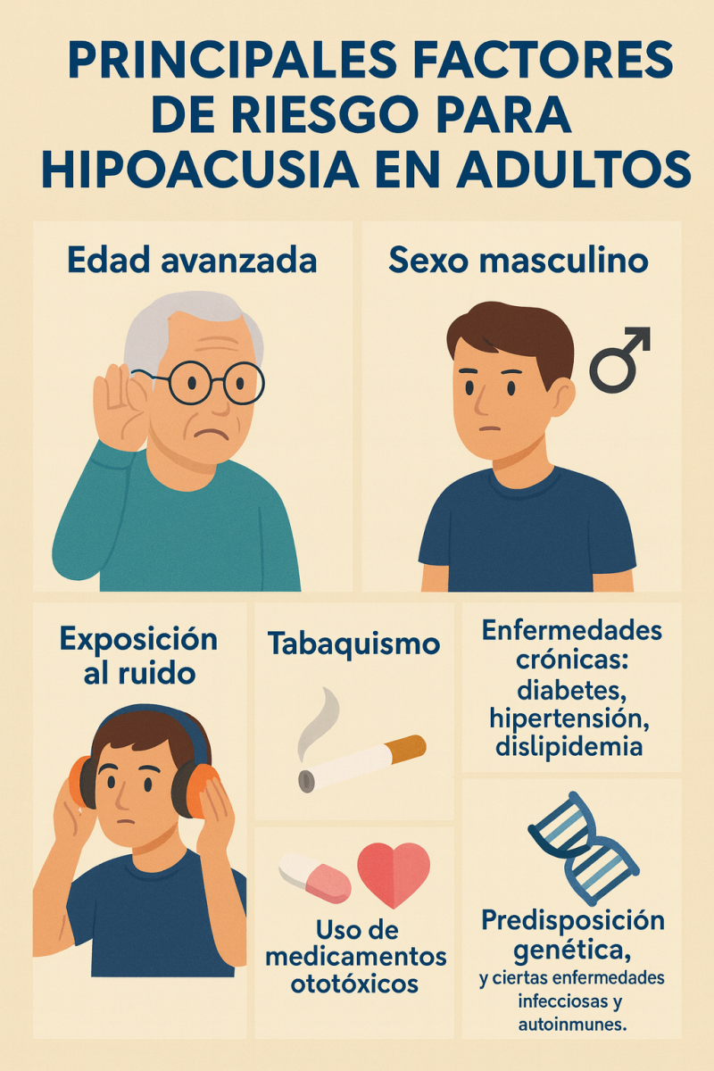 Los factores de riesgo para hipoacusia en adultos son multifactoriales e incluyen componentes genéticos, ambientales, médicos y conductuales. El envejecimiento es el principal factor de riesgo, con una prevalencia que aumenta exponencialmente con la edad debido a la pérdida progresiva de células sensoriales en la cóclea, que no se regeneran. El sexo masculino y la menor pigmentación coclear (piel clara) también se asocian a mayor riesgo.