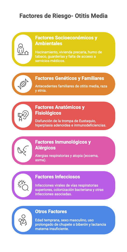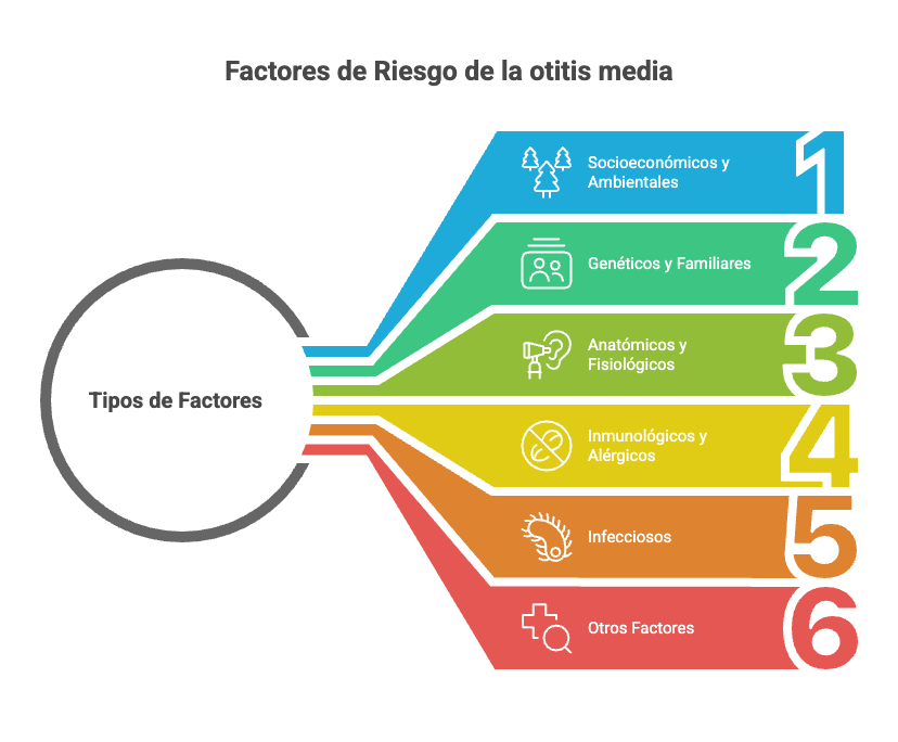 Antecedentes familiares de otitis media: Existe predisposición genética que puede influir en la anatomía o función del tracto respiratorio superior y el sistema inmune.