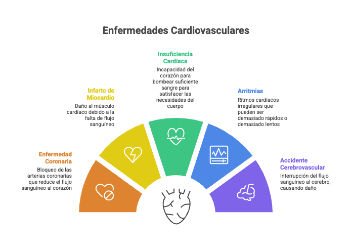 Las enfermedades cardiovasculares son un grupo de trastornos que afectan el corazón y los vasos sanguíneos. Incluyen condiciones como la enfermedad coronaria, infarto de miocardio, insuficiencia cardíaca, arritmias, y accidente cerebrovascular. Estas enfermedades están asociadas con factores de riesgo como hipertensión, dislipidemia, obesidad, diabetes, tabaquismo y sedentarismo. Su patogenia suele implicar daño aterosclerótico, inflamación vascular, y alteración en la función cardíaca.